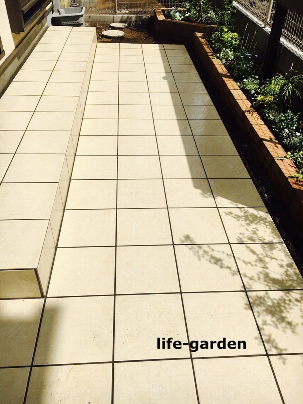 庭側はお隣の目隠しと、花壇そしてタイルテラス。